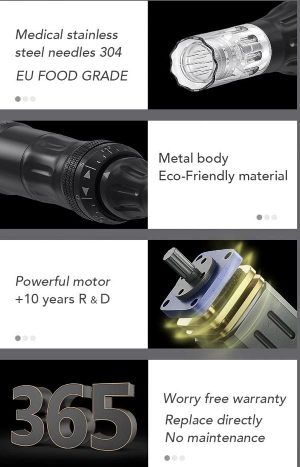 This electric microneedling device is valued for its versatility and control. Adjustable speed levels and stable motor performance allow professionals to customize cosmetic protocols based on treatment area and technique.